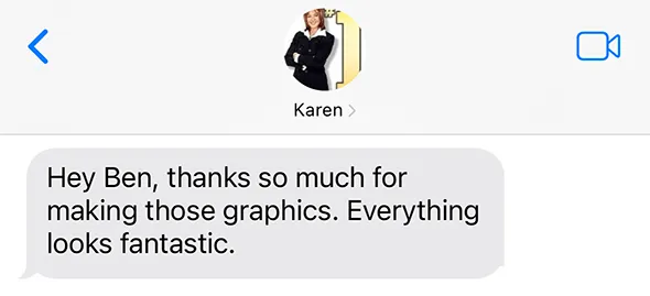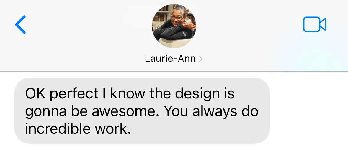 On your day, we’ll communicate via text message and Google chat. You can expect lots of quick back-and-forth messages as I work on your project and we nail down your design together.